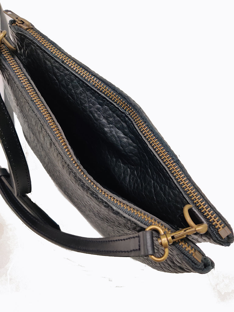 #3745 "Cibolo" Cross Body American Bison. Color Black "Cobblestone" 2 exterior zip compartments with slide in area between the 2 compartments - Dimensions: 8" H x 12 " L x 2" D